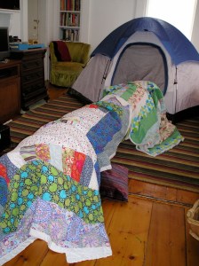 The quilts are now well-worn and well-loved additions to a tent pitched inside the house, or on top of a fort. Putting up a tent and adding some tunnels and cushions can turn the whole day around. -Lucy Mink-Covello, 2012