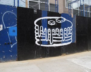 There’s been a lot of construction on our block in Williamsburg.  This wall of blue and black plywood was right outside my studio so one Sunday morning I took my black paint and brushes and made a flap jack painting somewhat like the ones I’d been making in oil paint in my studio only this one was large and very public. A week or so later the fence was disassembled, shuffled and then eventually tossed out. I traded the oil painting with Judith Linhares for one of her great colorful gouaches.  -Katherine Bradford, 2012