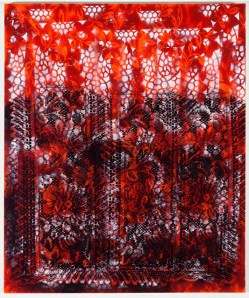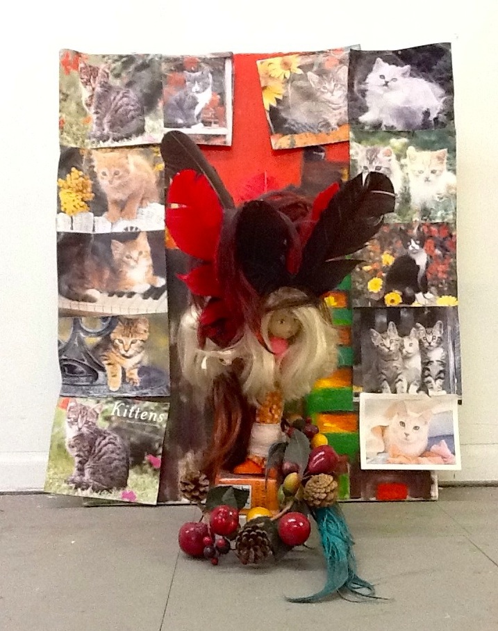 Not sure why I paired these. Probably could have paired the sculpture kitty marassa with anything in my studio. Perhaps it’s the palette. Marassa are divine twins in the Voudon religion typically represented by the Catholic chromolith of St. Cosme and Damian or the three virtues: faith, hope and charity. The painting inked seraph is evocative of a stained glass cathedral window and now that I look at it more closely has 3 distinct panels which relates nicely with the Catholic trinity and twa marassa. That is the aspect of twins as 3 which technically speaking the sculpture is representing because of the three figures tied together. Seraphim are a branch of angels in the Catholic and Hebrew bible, the burning ones, makes me think of light. The darker color filling up the lower half of the canvas made me think of a tattoo and tattooing light made me think of frozen light which made me think of the myth of fallen angels and maybe the creation of matter which gave me the title of the painting.