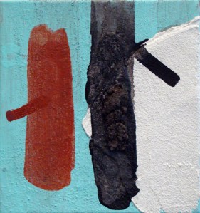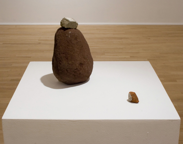 It started with one brown stone. I kept seeing it everyday on the way to my studio. Seduced by its bean shape and chalky brown color, I broke down one day and shuttled it upstairs with me. Initially I thought it would be inspiration for my paintings but as I began playing with it turning it over and balancing it on its side with the help of other little rocks, I started to see unique seemingly singular arrangements of this brown stone. Eventually, after many experiments, I found a sequence for placing the stone with 3 other smaller ones. I had to just leave it that way. A puzzle had been worked out in a way that felt strangely similar to how I solve painting problems. -Benjamin King, 2012