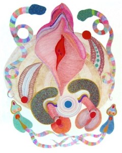 Though I have recently changed direction, attention to color, form and geometry permeate my work even as I moved from pattern to small horizontal landscapes and cityscapes. In recent drawings in ink and Flashe paint on paper, I expand on past obsessions. Detail and repetition have always been part of my method in realizing my ideas. I see geometry in architecture, in natural and human forms and wherever I look in my environment. In my early work I color-coded the Fibonacci series of numbers, the proportions of which are contained in the golden mean, the spiral, the sunflower seed pod and even within the human figure. I am working more intuitively now in a repetitive and gestural way focusing on natural, biomorphic forms with a meditative, sexually suggestive, surreal, somewhat pictorial and even humorous approach.