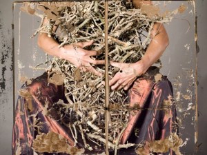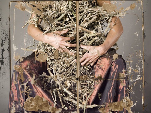 In Tender from 2007 I have manipulated the photo, layering it with altered book pages in photoshop, It’s almost like painting on the photograph. I love the nest of sticks in my lap. They are oddly reminiscent of the forms in my paintings; those tenuous piles precariously balanced over the figures. -Deborah Dancy, 2012