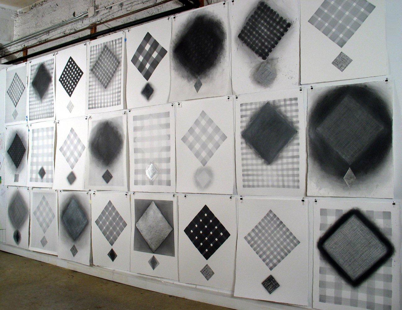 I work in a style that is reductive and geometric. My primary work is painting, primarily encaustic on panel. My secondary work, which I do each summer, is painting on paper, either with gouache made thin and grainy with water, or graphite powder suspended in alcohol. Where encaustic is hot and process intensive, gouache and graphite are cool, direct, and light on the brush. Usually color is the focus of my work, but after a series of monochromatic paintings in the spring—elongated diamonds within a square diamond field—I had a hankering to work achromatically in graphite. I transitioned onto paper, creating a series of interacting diamonds afloat on a field of indeterminate space. Despite the restricted palette, the work looks like color in black and white. I surprised myself. I love when that happens.  –Joanne Mattera, 2012