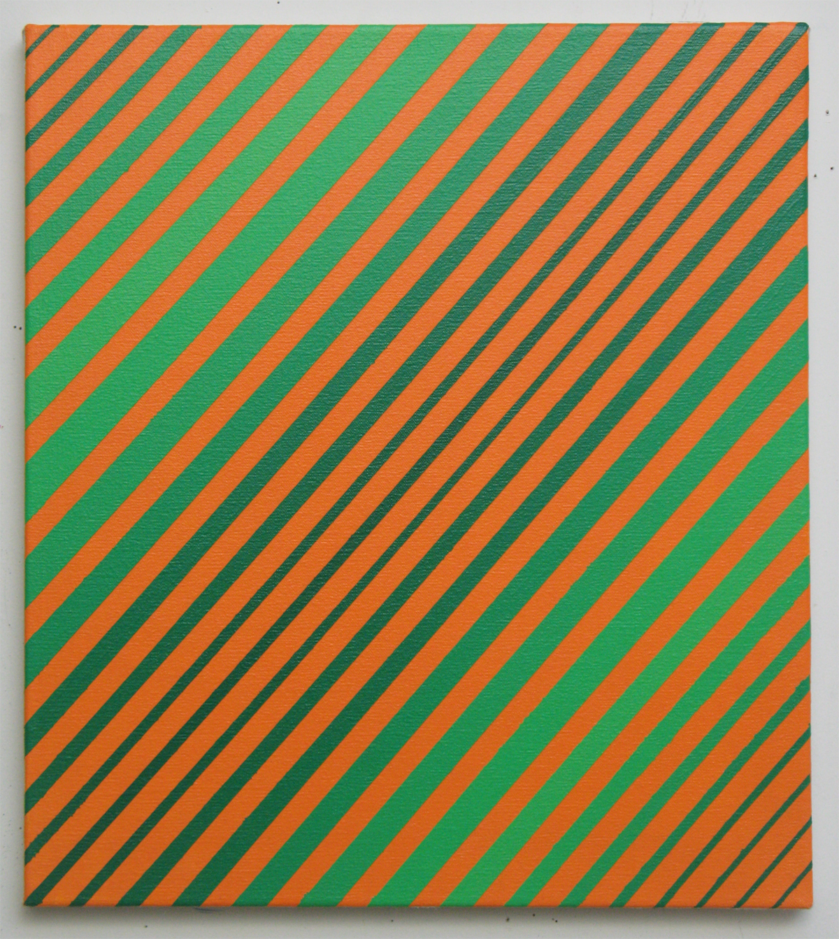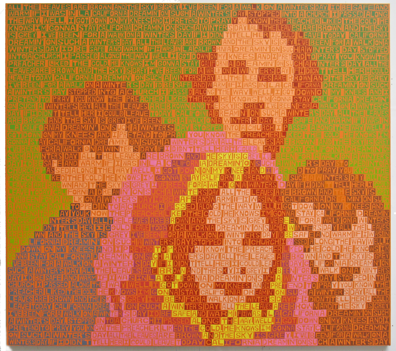 Making the large text/image paintings can leave me physically and mentally exhausted, so I sometimes like to blow off steam and make smaller, more experimental pieces on the side. On one recent occasion, I decided to “loosen up” a bit and play with gradations of color without the text, devising the tapering diagonal stripes and a simple system of where each color would go. I’m very interested in Op Art, so it was fun to create my own take on it off the cuff. The color relationships in this painting ended up being a big part of California Dreamin, so in this way it was also a color study, albeit an unconscious one. –Erik den Breejen, 2013